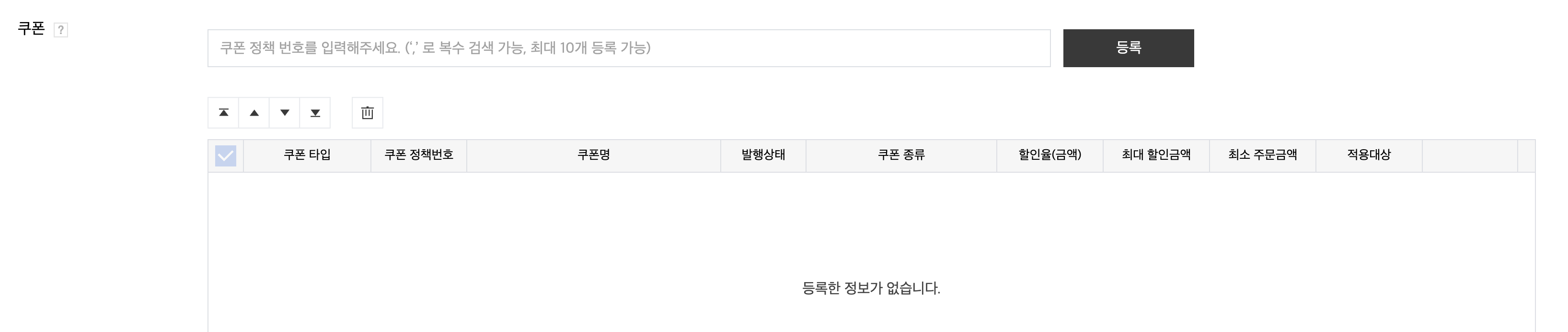 - 필수 정보를 입력 후 발행하면 쿠폰 정책 번호가 리스트에 생성됩니다.